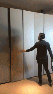 柜门的开合系统获得设计专利,使用时可以将柜门轻松无声的从最初的位置拉到隔间的一侧,让隔间完全打开。柜门打开后自身折叠,与相邻的隔间平行对齐,不会占用隔间前面的空间。