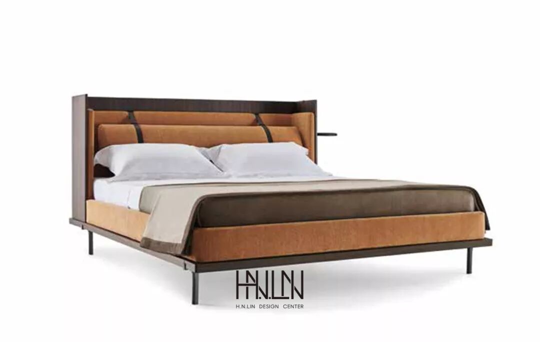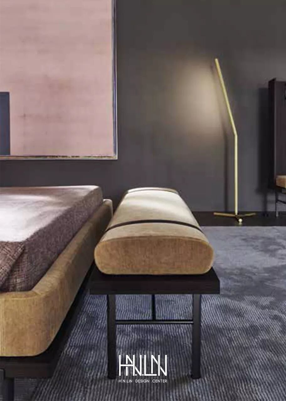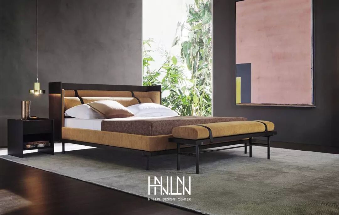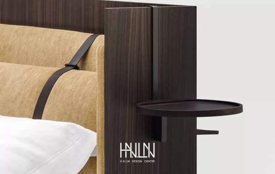 ▲ 床头内侧配衬柔软的针织面料或单色皮革,以此支撑中间舒适的靠枕,靠枕通过两条相同颜色的皮带固定在床头上,表现出设计师对细节的关注。床头木制外侧板上有两个圆形的悬空小托盘,起到床头柜的功能。
